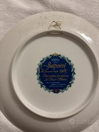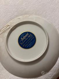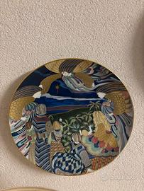 Due piatti con motivo dettagliato e colorato con accenti dorati che raffigurano figure mitologiche o angeli nel cielo notturno. Porcellana