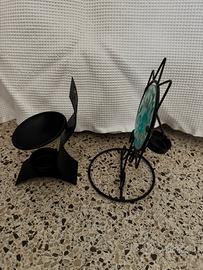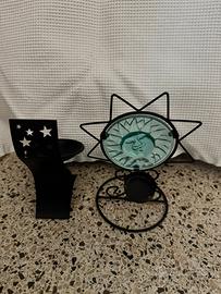 Due portacandele da tavolo decorativi, perfetti per creare atmosfera in casa. Cosa include il set: 1. Portacandela con stelle – in lamiera nera con stelle ritagliate, con coppetta porta tealight. Design moderno e minimalista. 2. Portacandela “Sole” – struttura in ferro battuto nero con portacandela in vetro trasparente lavorato a forma di sole, su base con volute decorative. Elegante e caratteristico. Materiali: ferro verniciato nero + vetro Stile: shabby chic / boho / romantico Usato – buone condizioni Ideali come centrotavola o decorazione per mensole e davanzali.