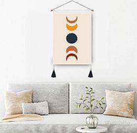 Il design è caratterizzato da colori terrosi e forme di fasi lunari 🌙 per creare un'atmosfera rilassante ed invitante e abbellire le pareti di casa. Si appendono tramite un supporto in legno con un cordino nero e due nappine decorative.