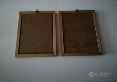Due quadretti per la camera dei bambini. Cornice in legno. Disegno su specchio. Dimensioni: 15,5x13,5 cm
