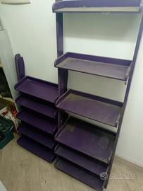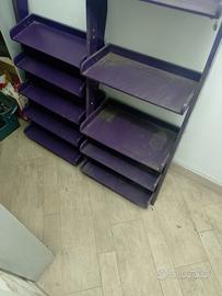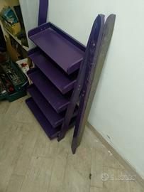 vendo 2 scaffali o mobiletti da appoggiare alle pareti di design uno alto 173 per 55 larghezza con profondità max 36cm a 15 cm l altro altezza 100 larghezza 55 si possono abbassare entrambi o alzare in base alle esigenze ci sono gli estensori, si possono usare come scarpiere,mobiletti bagno o ingressi sono color viola, in buono stato prezzo per entrambi 40 euro chiamare per venirli a visionare 3385243119