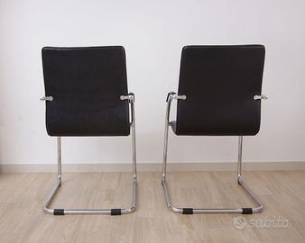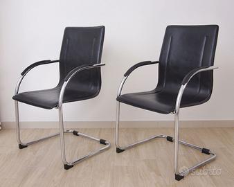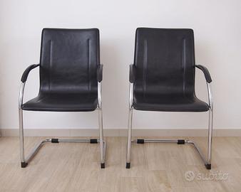 Eleganti sedie da ufficio dal design sinuoso e arrotondato, hanno struttura in acciaio cromato, un rivestimento per la seduta e lo schienale in pelle nera, facile da pulire. Seduta comoda e confortevole.