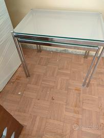 Due tavolini in acciaio e cristallo. Si possono mettere uno sotto l'altro. Vendo anche separatamente a 5 € l'uno. Sì trovano a Bardonecchia e devo toglierlo al più presto. Posso anche portarli a Collegno solo se interessati. Misure in foto.