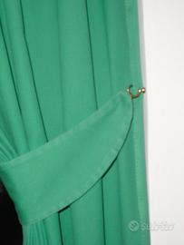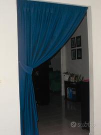 Due tende in tessuto di misto cotone lavorato, una blu e una verde. Arricciate con fettuccia regolabile ,dotata di ganci per il fissaggio su bastone ,adatte sia come calata su altre tende, sia come divisorio di due ambienti, perché double face, con ambras . Misura delle tende in estensione totale :larghezza cm 1,90 e altezza cm 2,13. In omaggio i bastoni per renderle complete all'uso .Confezionata da artigiano, ottimo stato, prezzo singolo euro 40 ,se acquistate entrambe prezzo d'occasione euro 70. Spedizione gestita dal venditore.