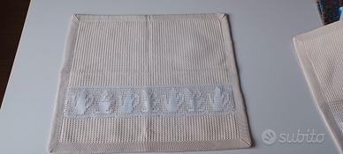 Coppia di tovagliette in cotone beige a nido d'ape con profilo in gros grain e pizzo decorativo bianco. Realizzate a mano. Dimensioni 50x43 cm. Nuove