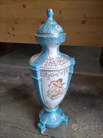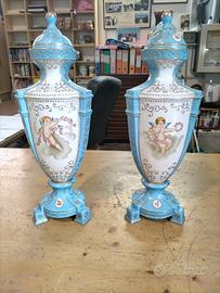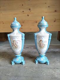Due bellissimi vasi gemelli in ceramica, sui colori dell' azzurro e del bianco. Con immagini di putti e fiori. Completamente integri.