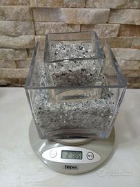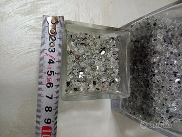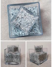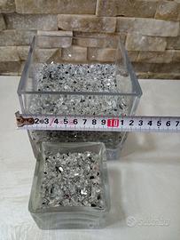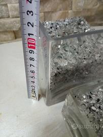 Set due vasi moderni in vetro grosso e trasparente Forma a cubo design minimal Completi di graniglia di vetro argento esattamente come in foto. Quello grande misura 12x12x12 Quello piccolo 7x7x7 Sono belli sia posizionati vicini che uno dentro l'altro per composizioni originali e sono perfetti anche per poter mettere candele. molto pesanti controllate l'ultima foto
