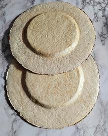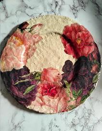 Vassoi decorativi artigianali in carta pesta, realizzati a mano con tecnica decoupage. Presentano un elegante motivo floreale con peonie e rose in toni rosso, rosa e bordeaux su sfondo naturale. Superficie leggermente irregolare e opaca, dal forte impatto visivo. Perfetti come centrotavola, complemento d'arredo o idea regalo.