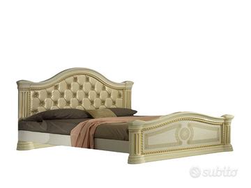 Testiera e Pediera Imponenti: il letto matrimoniale è il protagonista assoluto, con una testiera elegantemente sagomata e impreziosita dalla splendida imbottitura capitonné in ecopelle crème.