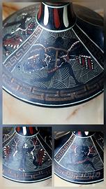 Vaso/recipiente decorativo con pittura mitologica - ceramica d'arte d'interni proveniente dalla Grecia Sul fondo si trova l'iscrizione "Inciso a mano,dipinto in Grecia" e il nome dell'autore "Vassilopoulos",a indicare che l'opera è originale o di una bottega familiare.La forma si ispira agli antichi vasi greci per vino(corpo alto,collo stretto,manico curvo)-oinochoe.La superficie è ricoperta da uno strato granulare decorativo con decorazioni dipinte a mano nello stile dell'antica pittura vascolare a figure nere.La pittura del vaso include tre scene mitologiche:🔸 Sulla destra si trova una figura eroica,probabilmente Eracle.L'uomo è raffigurato con due ali sulle braccia:una corporatura possente e una posa attiva,caratteristiche di un eroe.L'eroe è raffigurato in movimento,con enfatizzata forza e tensione corporea. 🔸 Al centro si trova una figura femminile con due ali. L'immagine ricorda una dea alata o una sacerdotessa associata a miti e rituali.Nelle sue mani,tiene due uccelli con le ali spiegate,afferrati per la gola.Questo può essere interpretato come potere sulla natura,sacrificio o transizione tra i mondi.🔸 Sulla sinistra si trova la terza figura:l'immagine di un guerriero con un simbolo simile a una maschera,che allude al teatro greco antico e alle rappresentazioni religiose.La composizione è incorniciata da un meandro classico, simbolo di eternità e continuità della vita,connessione tra l'uomo e gli dei. Condizioni:La superficie è costituita da un rivestimento decorativo a grana fine,ricoperto da pittura e vernice.Nel tempo,le particelle potrebbero sgretolarsi:questo è normale per le tecniche degli anni '60-'80.Questo non è un difetto,ma una caratteristica dell'invecchiamento del materiale.Sull'ala sinistra di Ercole e sulla sua figura si notava un certo sgretolamento dello strato decorativo, tipico di questa tecnica.Tuttavia,queste aree sono state accuratamente restaurate e sono quasi invisibili.Il prezzo prevede difetti/650 g,altezza-25 cm,diametro-16 cm