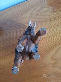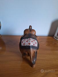 L'oggetto vanta dimensioni generose, con un'altezza di 18 cm alla proboscide, una lunghezza di 22 cm e una larghezza di 9 cm, che gli conferiscono una presenza solida e d'impatto su qualsiasi ripiano. Il calore del legno naturale è arricchito da eleganti venature e da una gualdrappa decorativa sul dorso, intagliata con motivi geometrici e rifinita con piccoli dettagli rossi che ne risaltano il carattere etnico e vintage.