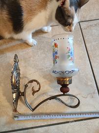 N.1 PZ.Si tratta di un'applique da parete decorativa vintage, probabilmente in ottone e vetro smerigliato con motivi floreali dipinti a mano. La base e il braccio sono in finitura anticata con riccioli decorativi e una base a muro ornamentale. Il paralume ha un bordo smerlato e dipinti floreali colorati in vetro smerigliato.