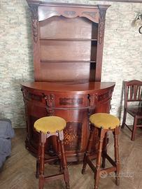 Vendo elegante bancone bar in legno con 2 sgabelli abbinati bar in stile classico, inclusi nel prezzo 2 sgabelli coordinati. Vendo per cambio arredamento.