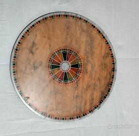 Piano: Disco estraibile in marmo pregiato con decorazione centrale a mosaico geometrico "a ruota" e bordo perimetrale intarsiato con tessere policrome (stile cosmatesco/mosaico).