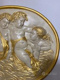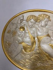 Aggiungi un tocco di eleganza classica alla tua casa con questo splendido bassorilievo ovale. L'opera raffigura una scena allegorica con tre putti (angioletti) immersi in un decoro naturale con tralci d'uva, simbolo di abbondanza e gioia.