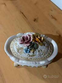 Propongo raffinata bomboniera / scatola decorativa con coperchio in porcellana italiana, finemente lavorata e impreziosita da fiori tridimensionali applicati a mano.