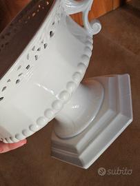 Raffinato centrotavola a foggia di alzata realizzato in ceramica lucida di colore bianco crema, firmato dall'esclusiva linea "L'Arte di Nacchi". Questo oggetto d'arredo si distingue per l'equilibrio tra gusto classico e dettagli artigianali, rendendolo perfetto sia come elemento decorativo per una zona living, sia come elegante portafrutta o fioriera.