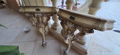 Le consolle si presentano in buone condizioni strutturali. La finitura mostra volutamente i segni del tempo, con una patina e un'usura che ne costituiscono il pregio e ne testimoniano il carattere "shabby chic" o anticato. Si consiglia di visionare attentamente le fotografie per apprezzarne ogni dettaglio.