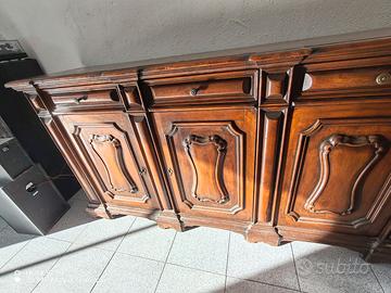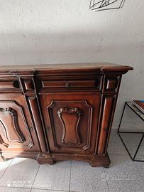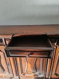 Vendesi splendida credenza bassa di alta ebanisteria, ideale per saloni prestigiosi, sale da pranzo o taverne signorili. Il mobile è ispirato allo stile classico italiano, caratterizzato da lavorazioni a rilievo sulle ante e dettagli intagliati di grande pregio.