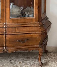 Elegante cristalliera classica in legno di colore medio con ante a vetro decorato, la lavorazione del legno è molto accurata, presenta lievissima imperfezione dovuta al tempo, ma non è segnata. Gli oggetti all'interno non sono inclusi.