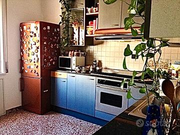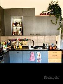 Elegante cucina componibile in truciolare multistrato rivestito in laminato goffrato color grigio selenio con cassetti e mensole color ciliegio, due pensili con antine in cristallo.