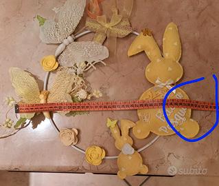 VENDO ELEGANTE GHIRLANDA O DECORAZIONE FUORIPORTA A TEMA PASQUALE. L'OGGETTO È DECORATO CON CONIGLIETTI GIALLI, FARFALLE E FIORI. FATTO ARTIGIANALMENTE. MISURE COME DA FOTO. NUOVO