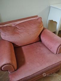 Ampio divano in tessuto rosa antico e collegata poltrona. Molto ben tenuto. Un solo piedino da sostituire. Regalo con ritiro a carico dell'interessato in Urbino.