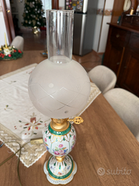 Base in ceramica decorata con motivi floreali, parti in metallo color ottone, globo in vetro satinato e ciminiera in vetro trasparente.