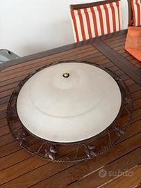 bellissimo lampadario a soffitto tipo plafone, ideale per soggiorno o sala. Struttura in ferro battuto con raffinate decorazioni a foglie, e diffusore in vetro satinato, molto elegante e di grande effetto. Stile classico ma senza tempo, dona un'atmosfera calda e raffinata all'ambiente. In ottime condizioni.