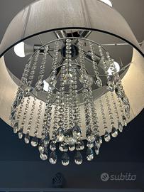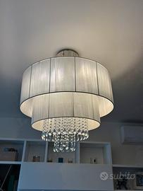 Lampadario a due piani con un design, perfetto per illuminare il soggiorno o la sala da pranzo. - Struttura in tessuto. - Dettagli in cristallo pendenti. - Colore bianco e trasparente.