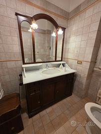 Elegante mobile per bagno. In stile classico e di qualità, completo di specchiera sagomata impreziosita da 2 graziose appliques, piano in marmo con alzatine, lavabo sottopiano e rubinetteria monocomando (e tappi per predisposizione rubinetti singoli).