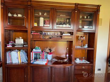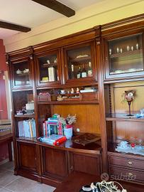 Questo è un mobile parete in legno massiccio, caratterizzato da un'elegante finitura di colore mogano intenso che ne esalta lo stile classico e raffinato.