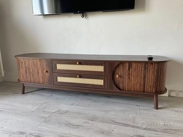 Vendo elegante mobile TV in stile vintage/retro, colore legno scuro con dettagli in rattan e maniglie dorate.