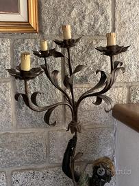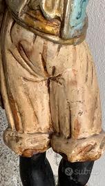Vendo bellissimo moro veneziano in legno intagliato e dipinto a mano, con finiture dorate e base decorata. La figura sostiene un raffinato candelabro in ferro battuto a quattro bracci, ideale come pezzo d'arredo di grande effetto scenografico.