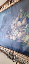 Splendido dipinto a olio su tela raffigurante una ricca composizione di frutta (uve, pesche, prugne) disposta su un piano di pietra, con un raffinato drappo verde a fare da sfondo. L'opera è firmata in basso a sinistra (firma leggibile come "P. Corsi").