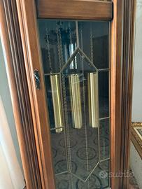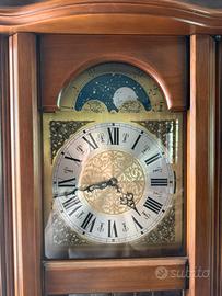 Vendesi splendido orologio a pendolo d'epoca a cassa alta, un pezzo di prestigio per un salone o uno studio di carattere. Questo orologio a colonna è realizzato in legno massiccio di noce lucido, con una finitura ricca e curata nei dettagli, in perfetto stile classico barocco. Il quadrante, visibile nell'immagine, è un capolavoro di orologeria d'epoca: presenta indici in numeri romani bianchi su fondo dorato e un elaborato traforo centrale in oro. Sopra il quadrante principale, una fase lunare dipinta con una mezzaluna e stelle su cielo scuro aggiunge un tocco di eleganza e funzionalità (da verificare la funzionalità se è solo estetica). La cassa centrale in vetro, incorniciata da modanature scanalate e dettagli dorati, svela tre imponenti pesi a colonna dorati e un pendolo a disco dorato, il tutto pulito e privo di riflessi fastidiosi. Il mobile ha una base svasata e una corona superiore a "pasticcio" curvo. Condizioni: L'orologio è in ottime condizioni estetiche. La cassa in legno è pulita e priva di graffi evidenti. Il quadrante, i pesi e il pendolo sono lucidi e ben conservati. Da revisionare