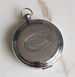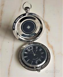 Raffinato Orologio da Tavolo, a forma di fiaschetta (quando è chiuso), acciaio inox, quadrante nero lucente, testurizzato, diametro 10 cm.