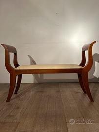 Elegante panca in legno di Noce Tanganika con seduta imbottita in pelle, caratterizzata da linee raffinate e braccioli curvi molto eleganti.