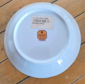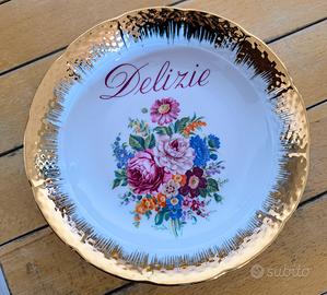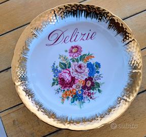 Elegante piatto vintage in porcellana Limoges, con un raffinato bordo dorato e decorato con un bouquet di fiori colorati. Bordo dorato con motivo a raggiera, decorazione floreale centrale. Diametro 20 cm. Porcellana Depos Limoges, scritta Delizie in corsivo rosso.