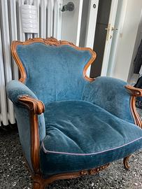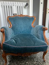 L'oggetto è in ottime condizioni generali. La struttura in legno è solida e stabile. Il tessuto è ben conservato, con la normale e affascinante patina del velluto che ne testimonia l'autenticità vintage.