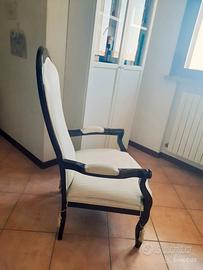 Elegante poltrona in stile classico per camera da letto, realizzata in legno massello color mogano rosso scuro e tessuto damascato bianco. Tenuta molto bene.