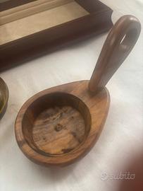 Elegante porta olio vintage con base in legno di olivo. - Vetro ambrato di alta qualità. - Base e tappo in legno di olivo lavorato.