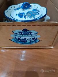 Elegante portabiscotti in fine porcellana VENETIAN LAGOON con decorazioni floreali blu ed oro ,bordo traforato con dettagli dorati,manici laterali per una presa facile Mai usato ancora nella scatola originale