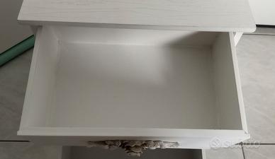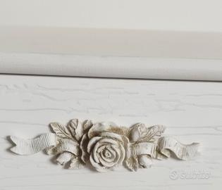 Elegante portagioie in legno massiccio, perfetto per organizzare i tuoi gioielli. - Decorazione floreale con nastro. - Finitura in legno con venature. - Tre cassetti capienti, misure: 24x15 cassetto, altezza 7,5 cm - Misure totali portagioielli 30 larghezza x 33 altezza x 19 profondità - I cassetti sono sempre stati utilizzati con del panolency rosa per non rovinarli e proteggere i gioielli. Vi verrà fornito insieme al portagioie. - Sono disponibile per la consegna a mano