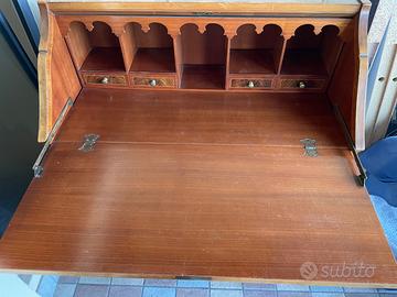 Vendo splendida ribaltina (bureau) in stile Chippendale della metà del 900, in radica di noce piumata, buono stato di conservazione. Il mobile si distingue per l'alta qualità ebanistica e i dettagli raffinati: • Materiali: Frontale e calatoia (ribalta) in pregiata radica di noce con venatura "a piuma" simmetrica • Dettagli di stile: Gambe mosse a cabriole con tipico intaglio a conchiglia sulla fascia centrale e piedi a "artiglio su sfera" (claw and ball). • Interno (Scarabattolo): Vano interno spazioso con scomparti a ogiva, cassettini tilettati e piano di scrittura originale. • Accessori: Bocchette e maniglie originali in ottone lavorato. Il mobile è solido, sano e non presenta fori di tarlo. Ha solo bisogno di essere lucidato. Qualche graffio visibile. Prezzo: € 550€ trattabili. Consegna: Ritiro a mano a Macherio o spedizione a carico dell'acquirente.