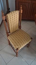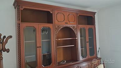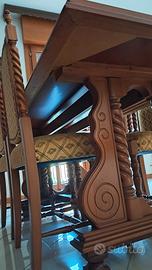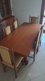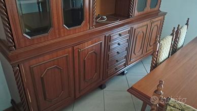 Vendesi splendido coordinato per sala da pranzo in stile classico/rustico con pregiate lavorazioni a torciglione. Il set è composto da mobili di solida manifattura, ideali per arredare con calore e prestigio ambienti ampi o taverne signorili. Il set comprende: Grande Credenza/Vetrina: Parete attrezzata con ampi vani contenitori, ante a vetro con ripiani interni, cassettiera centrale e vano a giorno con schienale decorato e cornice ad arco scolpita. Tavolo da Pranzo: Robusto e imponente, caratterizzato da un basamento artistico a doppia colonna con volute intagliate e traversa di rinforzo. Set di 6 Sedie: Sedie coordinate con gambe e montanti a torciglione. Seduta e schienale imbottiti e rivestiti in pregiato tessuto damascato color oro/beige con motivi classici, rifinite con borchie perimetrali. Stato: I mobili sono in condizioni eccellenti, privi di graffi profondi o danni strutturali. Tappezzeria perfettamente conservata. Note: Smontaggio e trasporto a carico dell'acquirente. Disponibile per visione su appuntamento a Urgnano (BG)