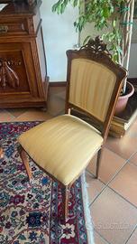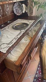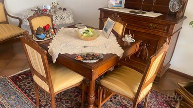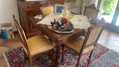Elegante sala da pranzo completa in stile classico, composta da credenza con alzata intagliata, tavolo in legno massello e sedie imbottite coordinate. Il mobile presenta lavorazioni decorative scolpite ed è in ottime condizioni, sempre tenuto con cura. Ideale per arredamenti classici o rustici. Composizione: * Credenza con alzata (piattaia) * Tavolo in legno massello * Sedie coordinate Condizioni: molto buone, nessun danno strutturale. Merce e a Mestre , no spedizione