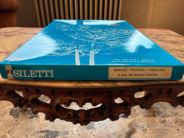 Splendido servizio da tavola vintage della prestigiosa tessitura Riccardo Siletti (Mongrando - Biella). Il set è un classico modello "Richelieu" in puro lino di altissima qualità, color avorio/ecru chiaro.