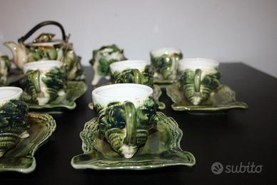 In vendita servizio da tè in ceramica smaltata, dal forte richiamo marino. Ogni pezzo è realizzato con splendide sfumature verdi e marroni, che ricordano i colori intensi delle alghe e delle conchiglie, con una smaltatura lucida che ne esalta le forme e i dettagli.