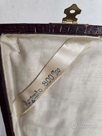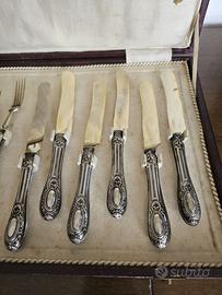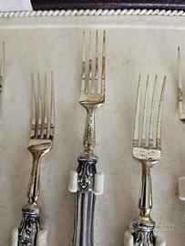 Bellissimo servizio di posate da dolce col manico in Argento 800, 12 pezzi. Buone condizioni, un po' di ossidazione sulla parte non in argento, come da foto. Graziosa confezione scatola espositore.
